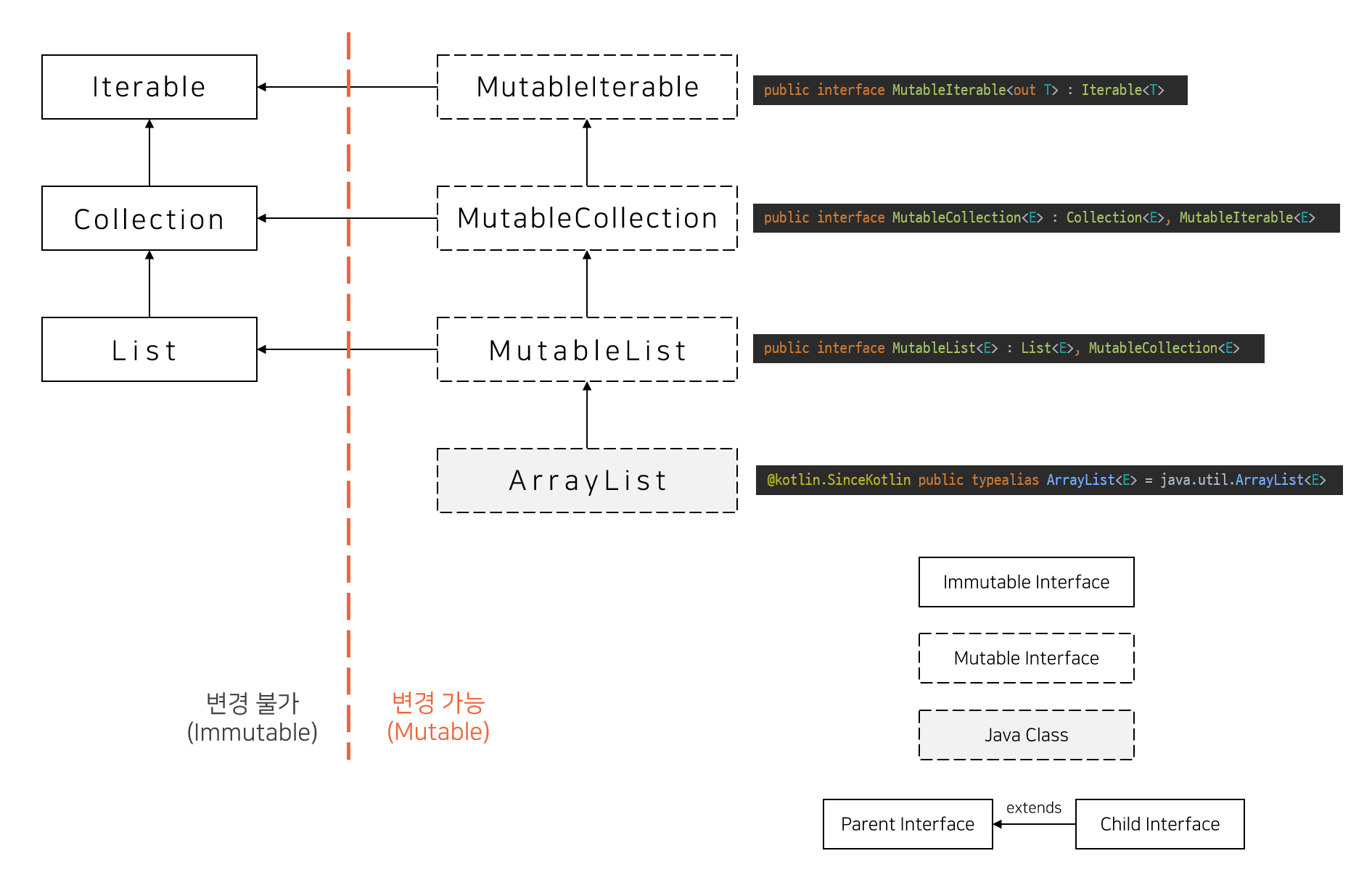 MutableList는 List Interface와 MutableCollection Interface를 확장하며, ArrayList는 MutableList Interface를 확장한다. 이러한 방식을 통해 자바에서 사용되는 ArrayList는 자바의 코드에서 코드를 그대로 가져옴과 동시에 MutableList Interface를 상위 타입으로 갖는 것처럼 취급된다. 이러한 방식을 통해 코틀린은 자바 호환성을 제공하면서 Immutable Interface와 Mutable Interface를 나눈다.