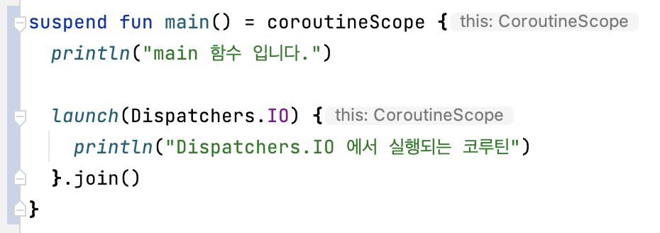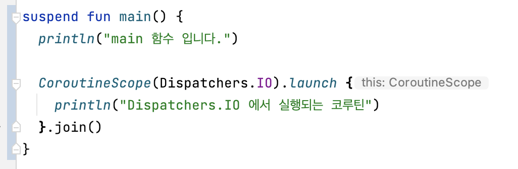 자 이제 그림2와 같은 코드를 실행해보자. 그림2에서는 Main Thread가 아닌 IO Thread에 코루틴을 실행 요청해 println 함수를 실행 하도록 만들었다.