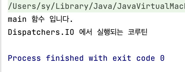 <그림2>의 코드의 결과는 <그림3>과 같다. 이유는 Dispatchers.IO에 실행 요청된 코루틴이 실행돼 출력이 일어나기 전에 메인 스레드의 작업이 모두 완료돼 프로세스가 종료되기 때문이다. Coroutine의 Dispatchers.IO가 사용하는 스레드들은 사용자 스레드가 아닌, 데몬 스레드(우선 순위가 낮은 스레드)이기 때문에 작업이 남아있더라도, 프로세스가 종료된다. 프로세스가 종료되면 데몬 스레드에 작업이 남아 있더라도 데몬 스레드의 작업은 강제 종료된다. 따라서 Dispatchers.IO에 실행 요청된 코루틴도 실행되기 전에 종료된다.