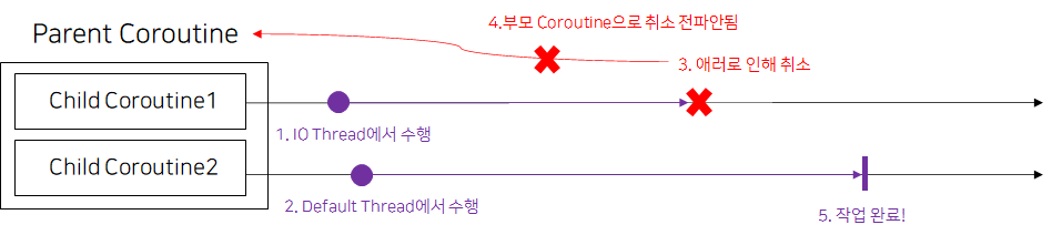 SupervisorJob을 자식 Coroutine(Child Coroutine)에 사용하면 애러가 부모 Coroutine(Parent Coroutine)로 전파되지 않는다.