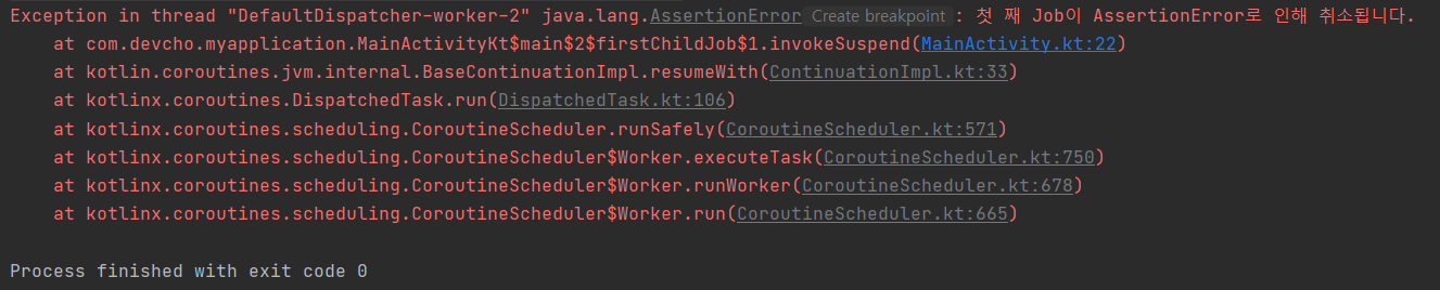 1. firstChildJob에서 Coroutine이 AssertionError로 취소된다.