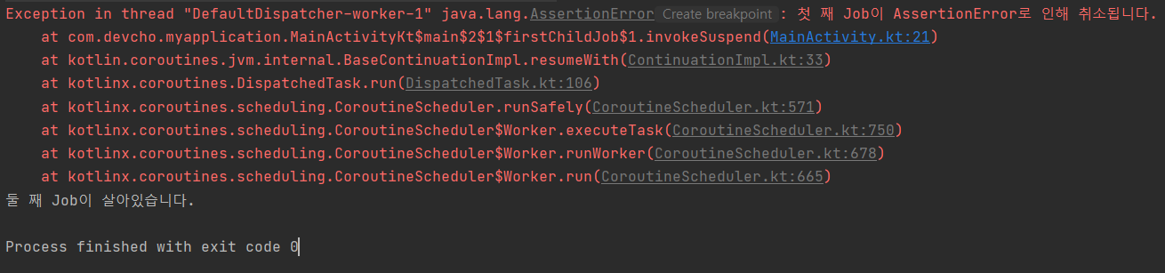 throw AssertionError("첫 째 Job이 AssertionError로 인해 취소됩니다.")