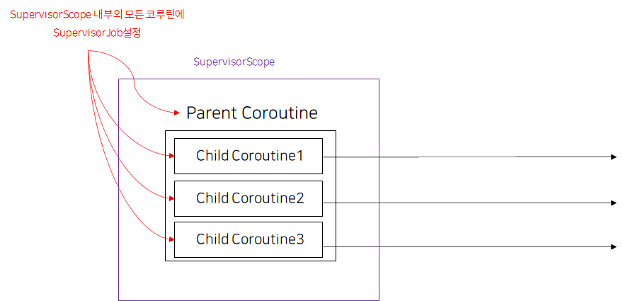 <그림1>과 같이 supervisorScope 내부에 코루틴이 있다면 모든 코루틴은 SupervisorJob의 적용을 받게된다.