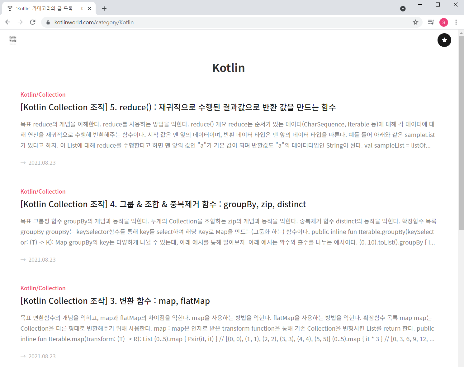 예를 들어 위의 주소를 웹브라우저의 검색 창에 치면 kotlinworld.com을 처리하는 서버는 /category/Kotlin에 대한 결과값을 사용자에게 View로 만들어 반환한다. 그 결과는 아래와 같다.