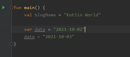 위의 방식에 따라 이 블로그를 위한 변수 두가지를 만들어보도록 하겠다. 먼저 val blogName 이라는 변수에 "Kotlin World" 라는 단어를 할당할 것이며, var date라는 변수에 "2021-10-02"를 할당할 것이다.