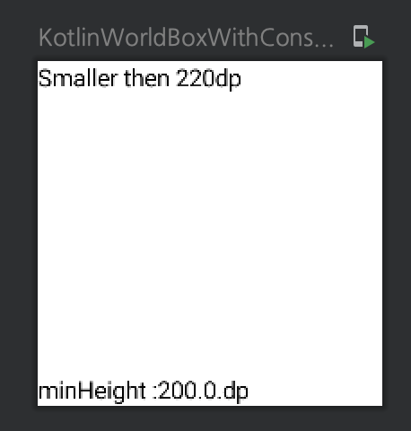 먼저 @Preview의 widthDp와 heightDp를 200으로 조정함으로써 BoxWithCosntraints가 Modifier.fillMaxSize()를 취했을 때 minHeight, maxHeight, minWidth, maxWidth가 200.dp가 되도록 조정한다. 이후 minHeight가 220dp보다 클 경우에만 Text를 출력하는 코드를 작성한다.
