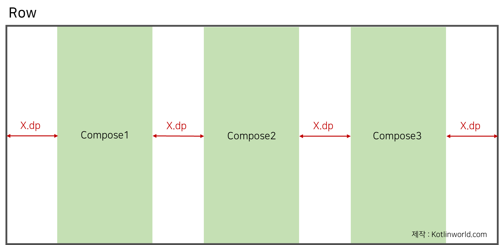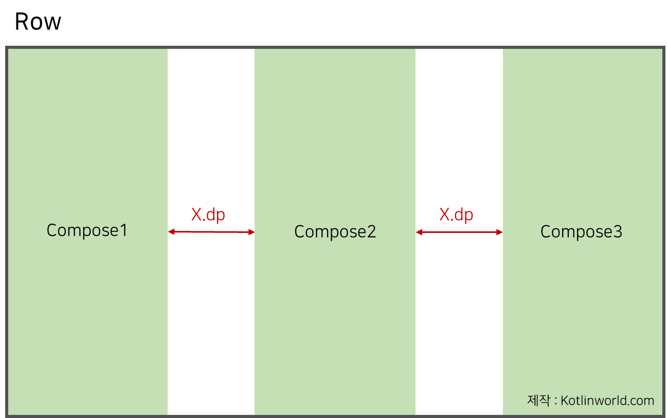 - SpaceEvenly은 양쪽 끝 컴포넌트와 레이아웃의 간격을 컴포넌트들간 간격과 같게 만든다.