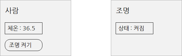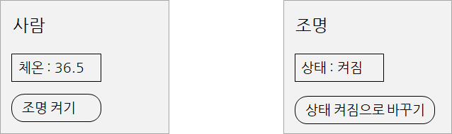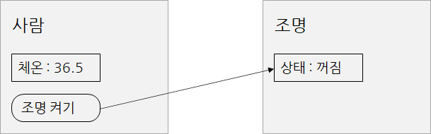 예를 들어보자. 사람들이 사용하는 조명, 펜, 가위 등은 사람에 의해 수동적으로 행동한다. 조명은 사람에 의해 켜지고, 펜과 가위는 사람에 의해 사용된다. 그렇다면 이러한 수동적인 객체들은 프로그래밍 상의 객체가 될 수 없는걸까? 당연히 될 수 있다. 수동적인 객체들을 자율적으로 만들면 된다. 수동적인 객체를 자율적으로 만드는 것이 어떻게 가능할지 아래 사람과 조명 예시를 통해 살펴보자.