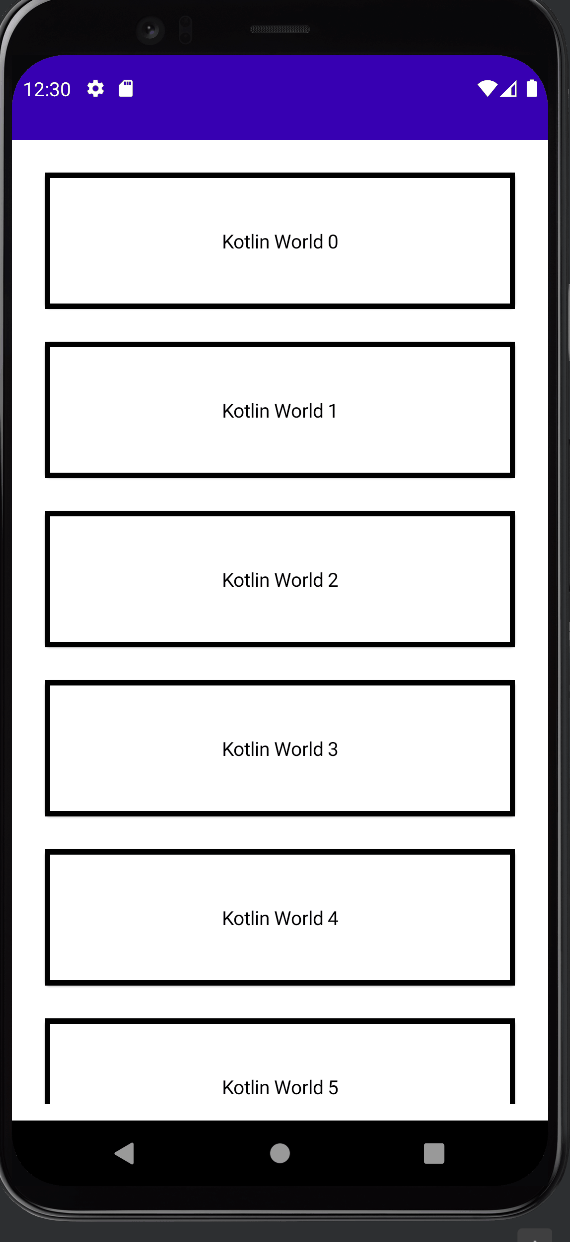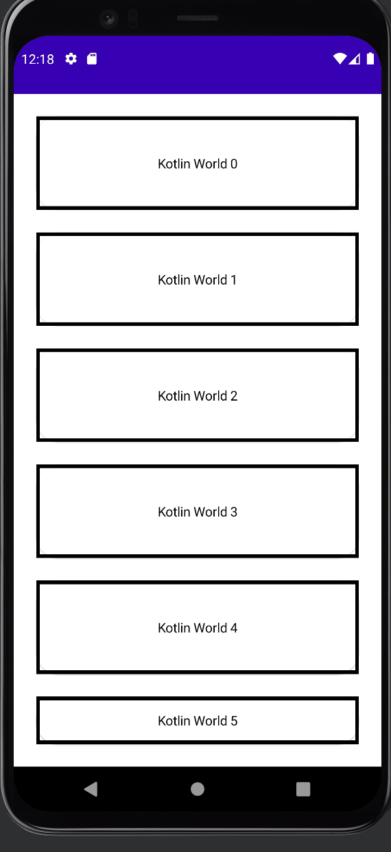 Scroll이 동작 하지 않는 것을 확인할 수 있고, 6번째 컴포저블인 "Kotlin World 5"의 사각형이 짤린 것을 확인할 수 있다.