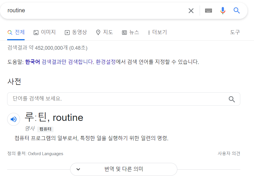 우리는 Routine을 운동 루틴 혹은 공부 루틴과 같은 '특정한 일을 하기 위한 일련의 처리 과정'이란 뜻으로 사용한다. 비슷하게 전통적으로 프로그래밍에서는 루틴을 '특정한 일을 처리하기 위한 일련의 명령'으로 사용해 왔다. 실제로 구글에 routine을 찾으면 아래와 같이 나온다.