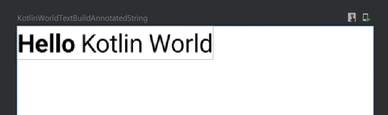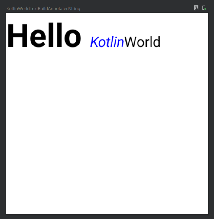 예를 들어 아래와 같이 "Hello Kotlin World"의 Hello에만 강조표시를 주고 싶은 경우 아래와 같이 하나의 Text 안에서 강조 표시가 가능해진다.