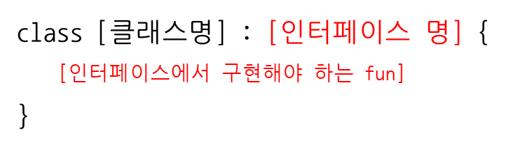 클래스는 ":" 뒤에 인터페이스가 오고 클래스에서는 인터페이스에서 구현해야 하는 fun을 구현해야 한다.
