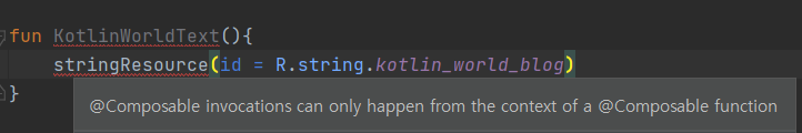 위 메세지를 번역하면 stringResource는 Composable 내부에서만 사용할 수 있는 function이라는 것이다.