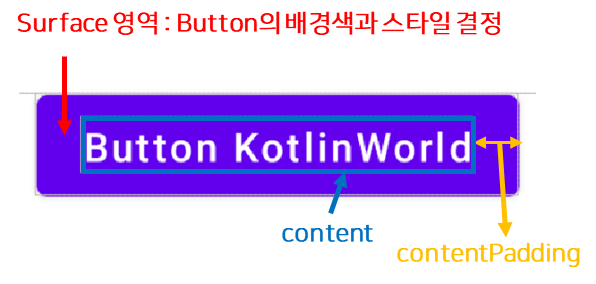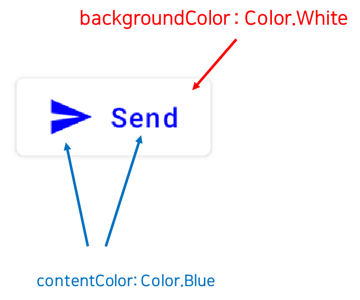 - contentColor : Button의 content 색상. 버튼을 표현하는 텍스트의 색상 등 - content 영역의 색상을 결정