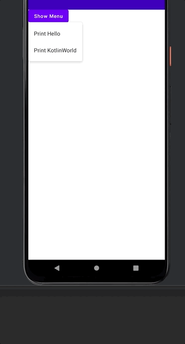 // 3.2. DropDownMenuItem을 정의하고 눌렸을 때 KotlinWorld가 출력되도록 함