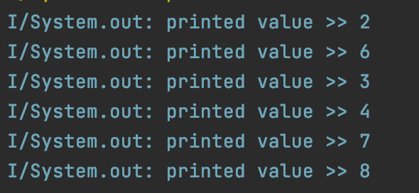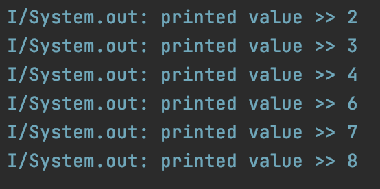 아래와 같이 1과 5를 발행하는 flow에 대해 +1, +2, +3 변환을 수행하면서 flatMapConcat을 사용해보자. 그러면 1에 대한 변환값인 2, 3, 4 와 5에 대한 변환 값인 6, 7, 8이 순서대로 나온다.