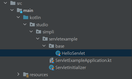2. 1에 의해 ServletExampleApplication 하위의 모든 패키지의 @WebServlet이 스캐닝 되므로 base 패키지를 추가하고 HelloServlet 클래스를 추가한다.