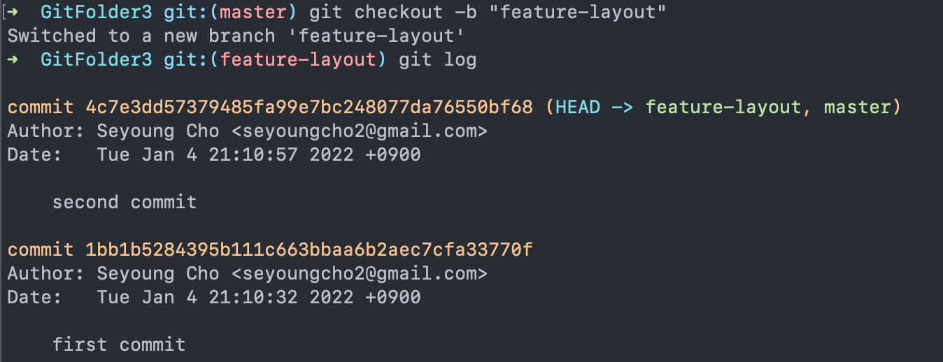 브랜치를 새로 만들게 되면 이전 master의 commit들이 그대로 새로운 branch의 commit이 된다. 그렇게 되면 master branch의 마지막 커밋은 feature-layout branch의 마지막 커밋이 되며 feature-layout branch의 HEAD가 된다.