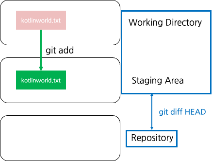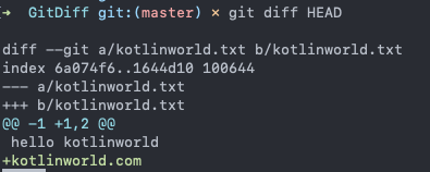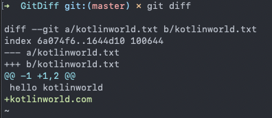 만약 아무런 옵션을 포함하지 않고 kotlinworld.txt 에 대한 git diff를 확인하고 싶다면 다음 명령어를 사용하면 된다.