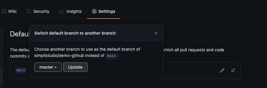 3. GitHub Repository-Settings-Branches-Default 브랜치에 들어가 Switch to another branch 버튼을 누른다.