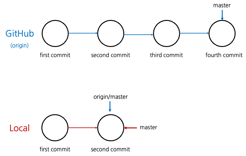 이를 최신 버전으로 업데이트 하기 위해서는 git fetch 명령어를 사용해야 한다. git fetch 나 git fetch [alias]를 사용하면 Remote Repository의 최신 커밋으로 Remote Branch를 트래킹하는 모든 브랜치들이 업데이트 된다. 예를 들어 git fetch origin 과 같이 사용할 수 있다.