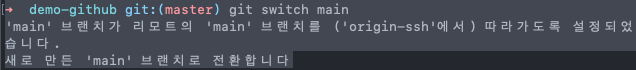 'main' 브랜치가 리모트의 'main' 브랜치를 ('origin-ssh'에서) 따라가도록 설정되었습니다.