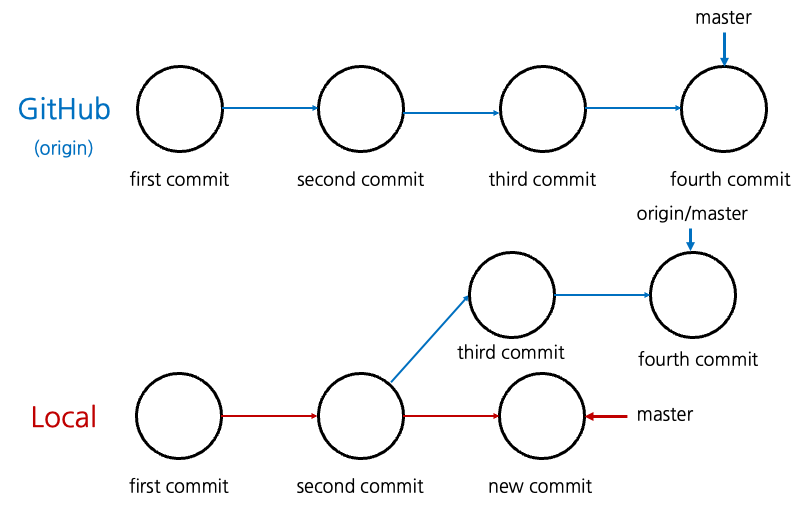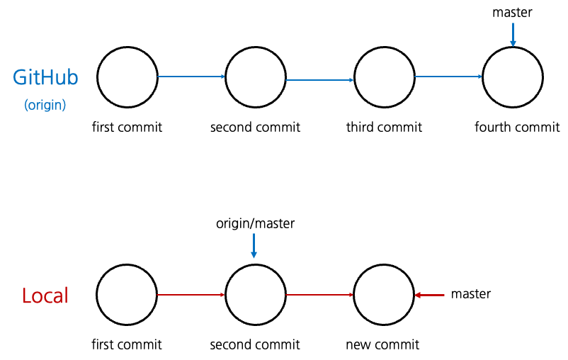 그 후 만약 협업하는 사람이 GitHub에 third commit과 fourth commit을 push 했고, Local 브랜치에는 나에 의해 new commit이 생겨났다고 해보자. 그러면 [그림2]처럼 GitHub의 master branch는 fourth commit을 포인팅 할 것이고, Local의 master은 new commit을 포인팅 할 것이다. 하지만 문제는 Local의 origin/master이다. 이 브랜치는 자동으로 업데이트 되지 않기 때문에 여전히 second commit을 바라보고 있다.