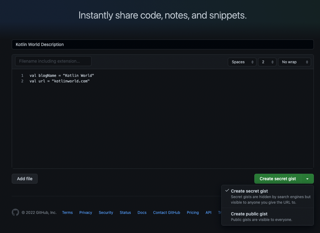 3. gist는 두가지 방식으로 만들 수 있다. 하나는 public 방식이고 하나는 secret(private) 방식이다. 코드를 공유해야할지에 따라 결정할 수 있다.
