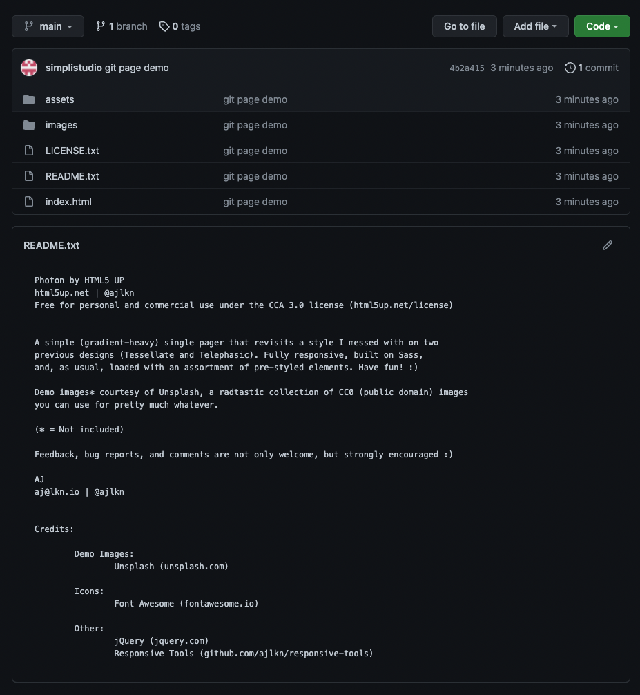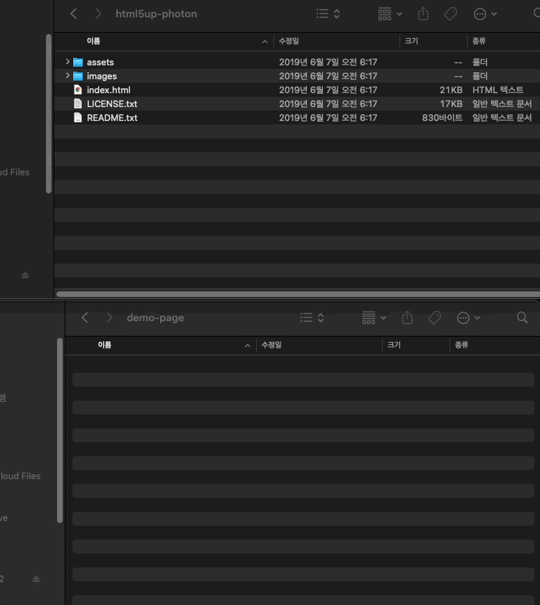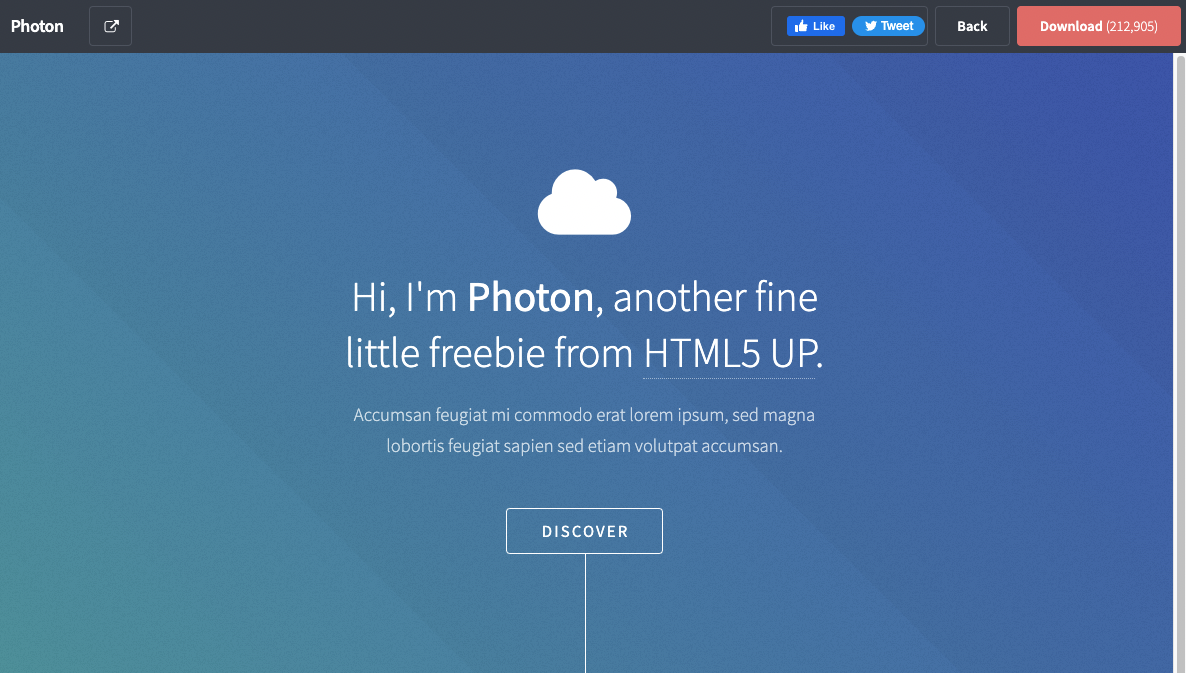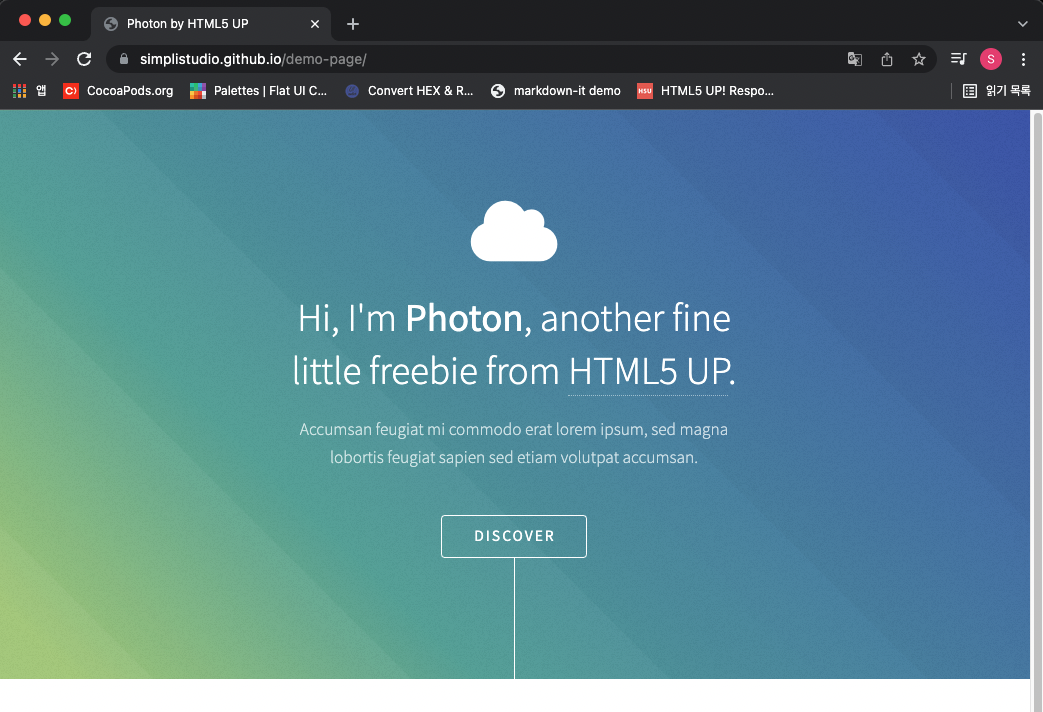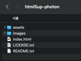 이번 글에서는 https://html5up.net/ 에서 제공하는 photon이라는 템플릿을 활용해 실습을 진행한다. Photon은 CCA 3.0 license를 사용하므로, 저작자를 표시해야 한다는 점을 주의하자.