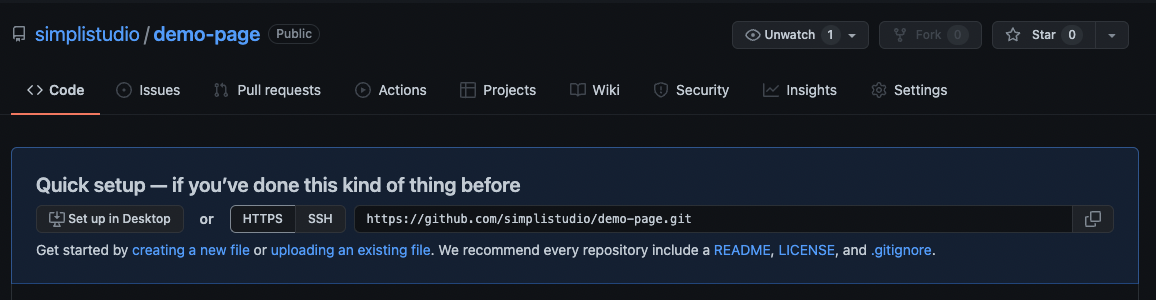 1. https://github.com/new 에서 저장소를 새로 만든다. 이 글에서는 저장소 이름을 demo-page라 한다.