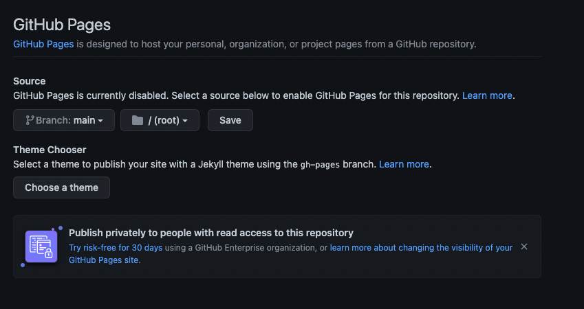 1. GitHub Page를 만들기 위해 Settings-Pages 탭에 진입한다.