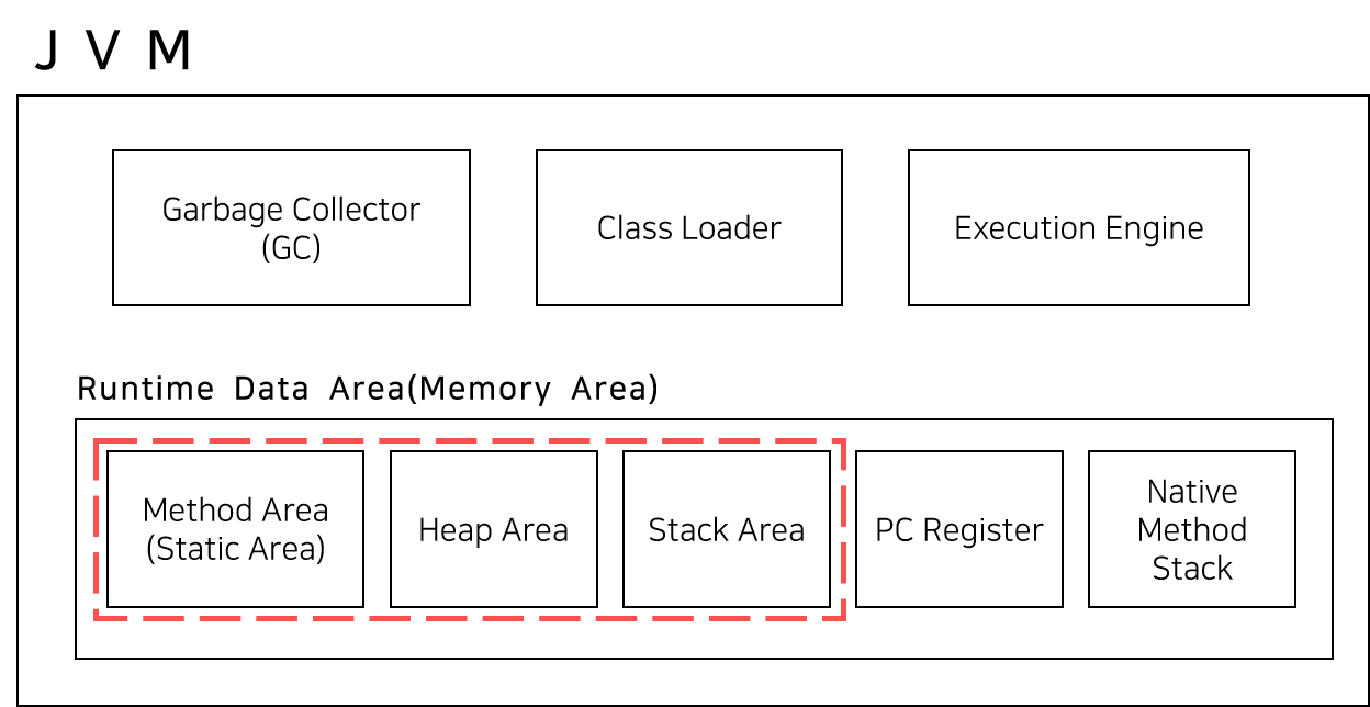 JVM은 Runtime에 Data를 올려놓는 공간인 Runtime Data Area를 가지고 있다. 이 공간은 총 5가지로 나뉘는데, 뒤의 PC Register과 Native Method Stack 영역은 Low Level의 Operation을 하기 위한 메모리 공간 이므로 이 장에서는 앞의 세가지 'Method Area(Static Area)', 'Heap Area', 'Stack Area'만 다룬다.