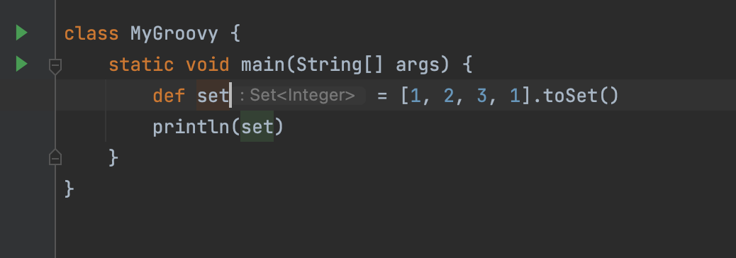 - groovy의 Set은 list에 toSet() 메서드를 사용해 만든다. as Set으로 타입 캐스팅으로 만들 수도 있다.