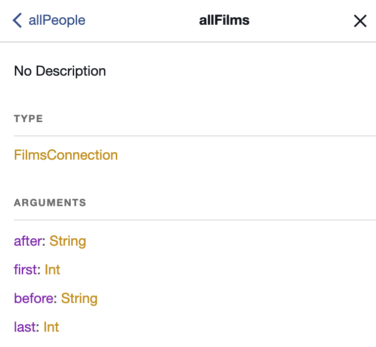 이 first나 last는 모든 필드에서 사용할 수 있는 것이 아니다. 서버에서 구현해주어야 사용할 수 있는 것이다. first, last와 비슷하게 orderBy, search 등의 인자가 들어갈 수 있는 경우도 있다. 이 인자값들은 반환되는 데이터를 정렬하거나 검색하기 위해 사용된다. 하지만, 위의 사이트에서는 이 인자들을 지원하지 않는다. 스키마 정보를 확인해보면 allFilms는 after, first, before, last만을 인자로 받을 수 있음을 확인할 수 있다.