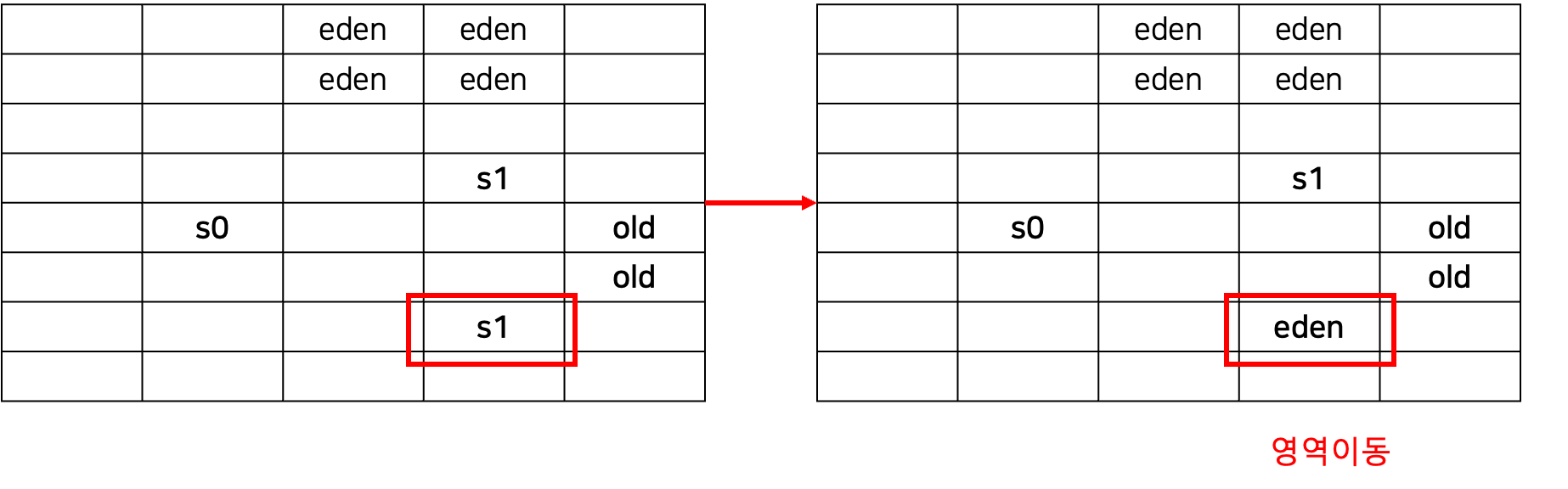또한 이전의 GC 들은 Young Generation에 있는 객체들이 GC가 돌때마다 살아남으면 Eden->Survivor0->Survivor1으로 순차적으로 이동했지만, G1 GC에서는 순차적으로 이동하지는 않는다. 대신 G1 GC는 더욱 효율적이라고 생각하는 위치로 객체를 Reallocate(재할당) 시킨다. 예를 들어 Survivor1 영역에 있는 객체가 Eden 영역으로 가는 것이 더 효율적이라고 판단될 경우 Eden 영역으로 이동시킨다. 즉, G1 GC부터는 더이상 Young Generation에서 영역의 순서가 보장되지 않는다.
