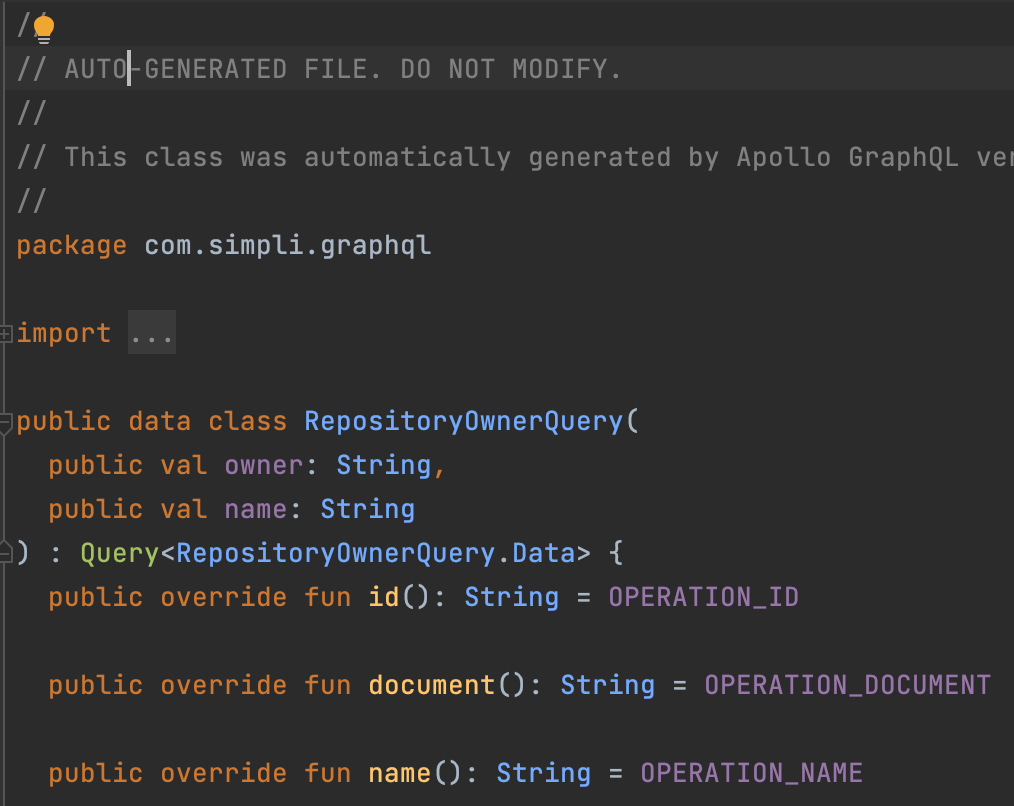 Apollo GraphQL은 query나 mutation을 입력하면 해당 query나 mutation에 맞는 클래스를 Auto Generate 하며, Generate된 클래스는 우리가 쿼리를 날렸을 때 응답으로 리턴된다. 즉, query, mutation 입력 만으로 응답을 받기 위한 객체들을 모두 만들 수 있는 것이다. 기존 REST API를 사용하기 위해서는 retrofit을 사용하더라도 응답을 받기 위해 데이터 클래스를 일일히 만들어 매핑시켜줬어야 했는데 해당 부분이 모두 자동화되었다.
