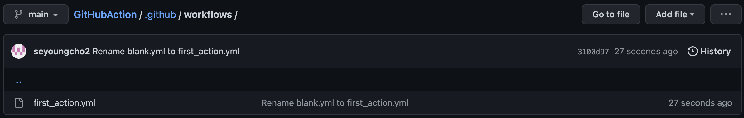 예를 들어 위의 그림에서는 first_action.yml이라는 Workflow 파일이 있다. 하지만 여기서 파일 이름인 first_aciton이 Workflow의 이름은 아니다. Workflow 파일 내부에는 name: [Workflow 이름] 이 있는데 여기서 Workflow의 이름을 설정한다.