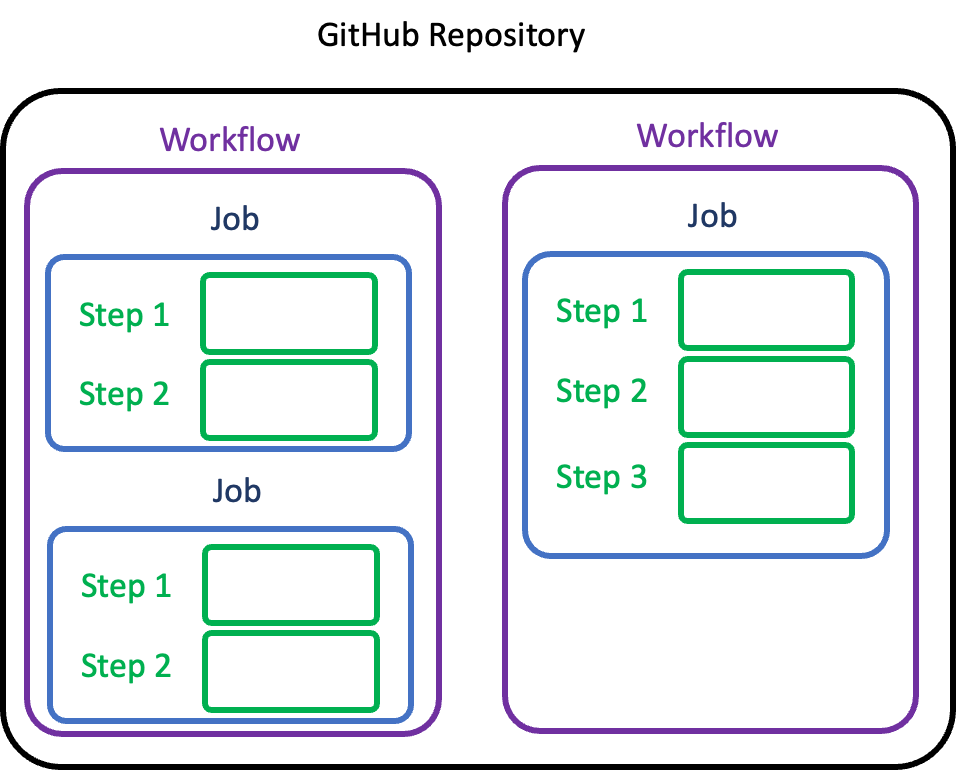 GitHub Actions는 Workflow, Job, Step 세가지 구성요소로 이루어진다. Step은 Job에 포함되고, Job은 Workflow에 포함된다. 즉, Workflow가 가장 큰 작업 단위이고, 그 아래 Job이 있고, Job 아래에는 Step이 있다. 이를 그림으로 나타내면 아래와 같다.