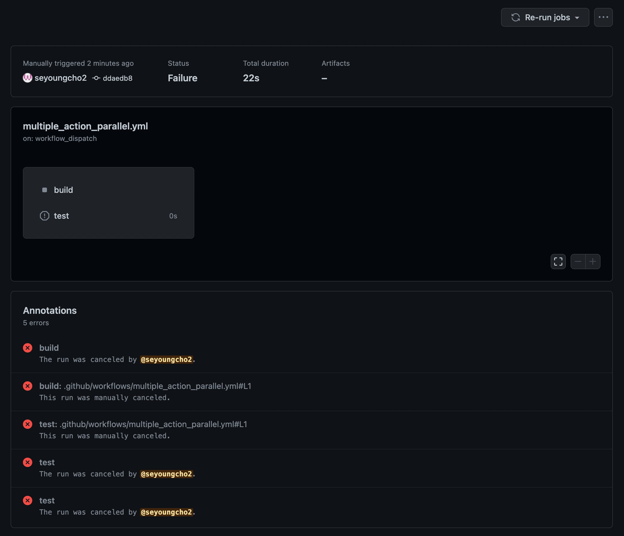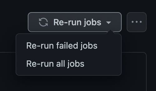 여기서 Re-run jobs 를 누르면 실패한 Job을 다시 실행하거나 Workflow 자체를 처음부터 다시 실행 할 수 있다.