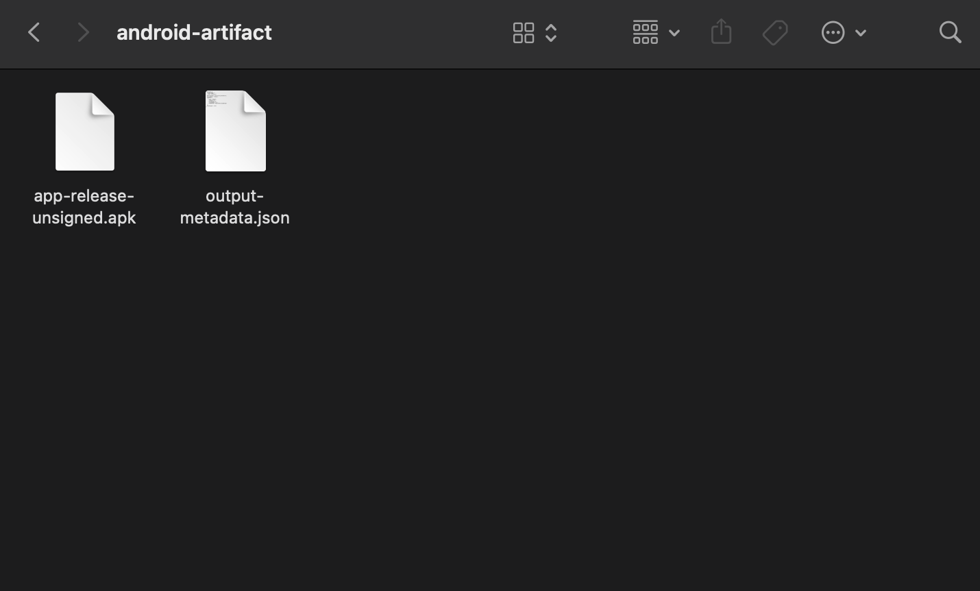 android-artifact.zip 파일을 다운로드 한 후 열어보면 다음과 같이 파일이 나오는 것을 확인할 수 있다. 위에서 ./gradlew assembleRelease를 실행했을 때 만들어지는 파일들(app-release-unsigned.apk, output-metadata.json) 이 모두 포함된 것을 확인할 수 있다.