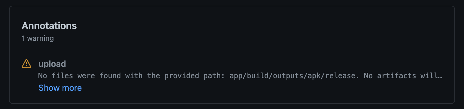 위 코드를 실행하면 다음과 같은 결과가 나온다. upload Job에서 No files were found 경고가 뜨는 것을 볼 수 있다.