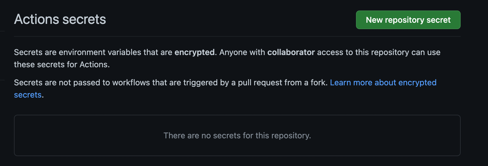 Secrets는 Environment Variable과 비슷하게 동작하지만, 외부로 공개되지 않는 Key-Value 쌍이다. 따라서 토큰이나 비밀번호 같은 보안이 필요한 정보들은 Secrets를 통해 저장해야 한다.