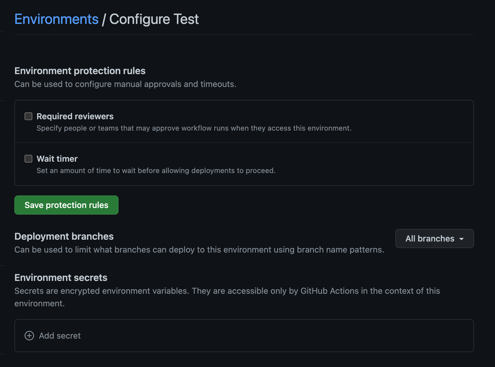 그러면 아래와 같은 화면이 나온다. 우리는 이에 대해 TOKEN을 설정할 것이다. 방금 생성한 environment는 test 환경이기 때문에 test-token을 값에 입력하고 Add secret 버튼을 누른다.