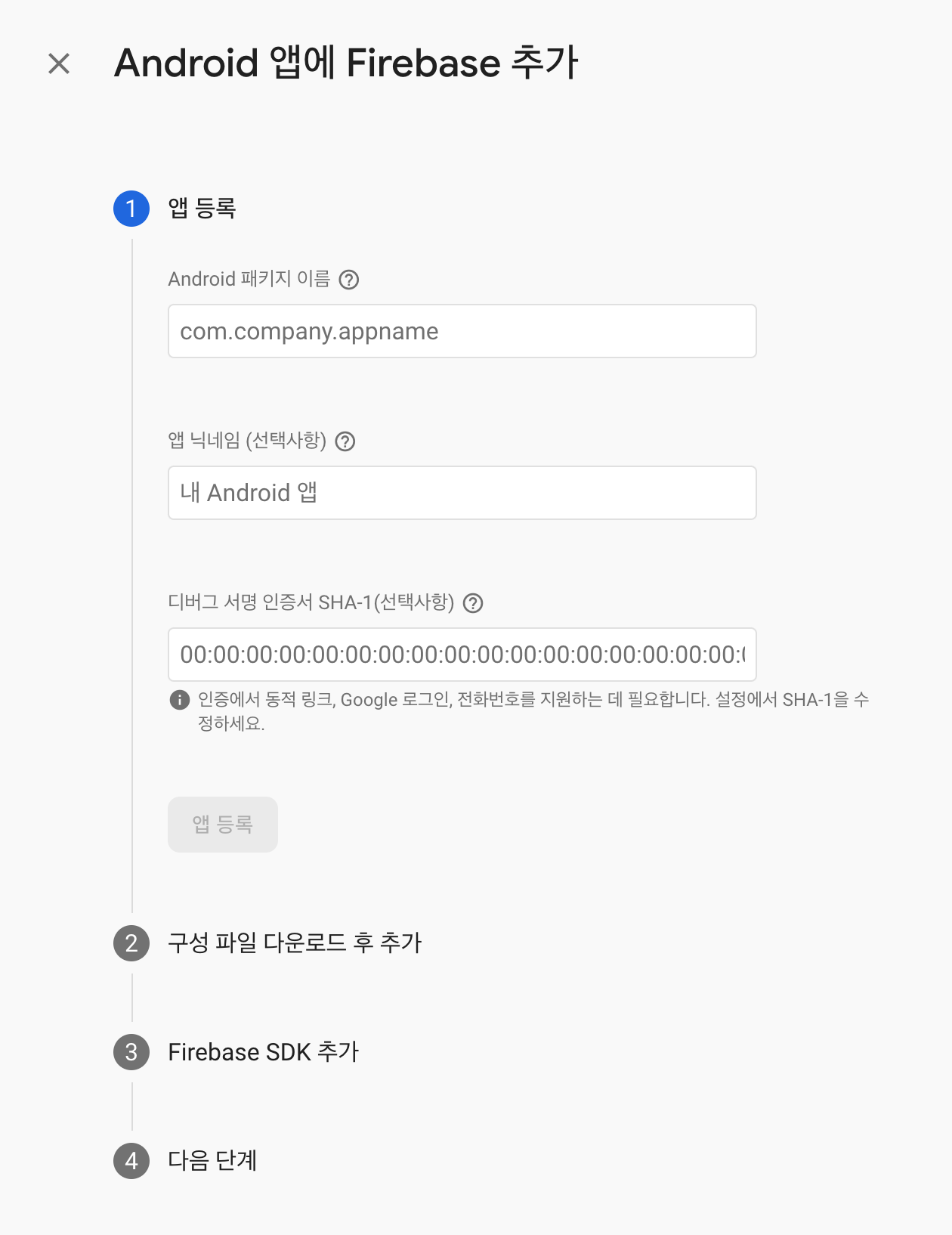 Firebase에서 처음 app을 등록할 때 추가할 수 있는 부분도 있다.