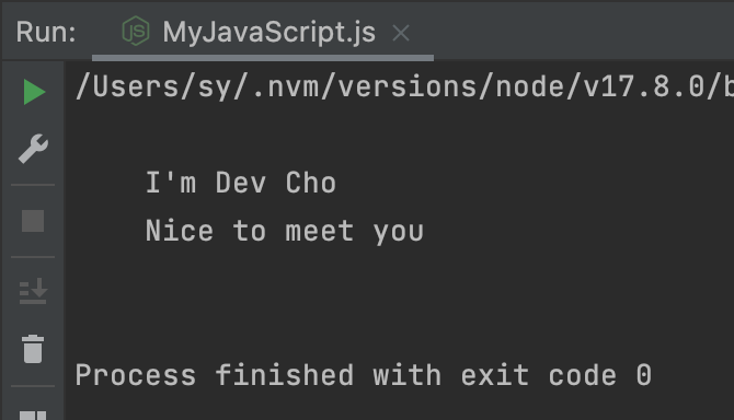 아래와 같은 결과가 나오는 것을 확인할 수 있다. 줄바꿈이 한 번 수행되어 I'm Dev Cho와 Nice to meet you가 서로 다른 줄에 있는 것을 확인할 수 있다.