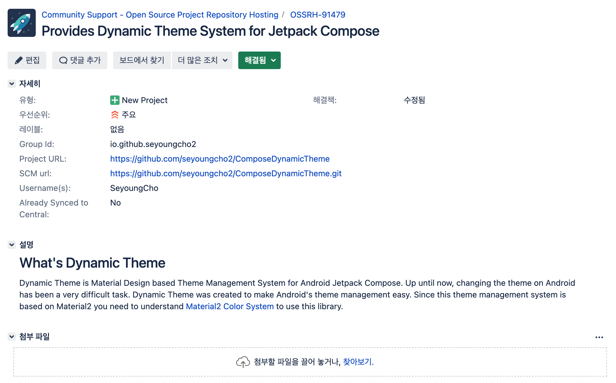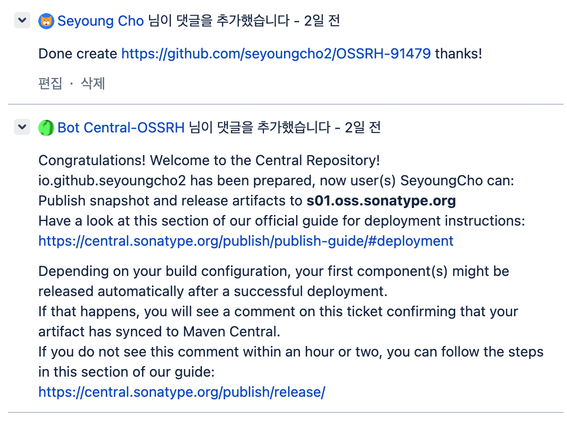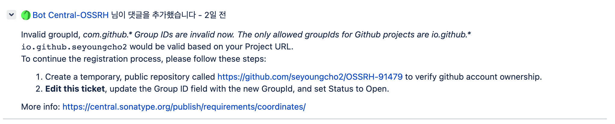1. 오픈소스 프로젝트의 소유주 인증을 하기 위해서는 Jira Issue 번호에 해당하는 이름을 가진 Repository를 해당 Url에 생성하라는 댓글이 달린다.