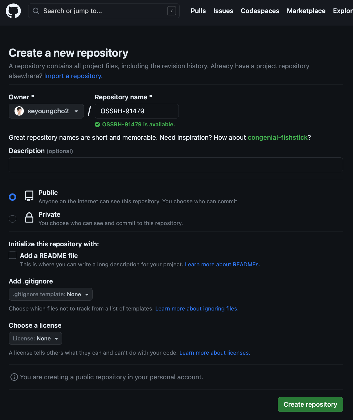 2. 내 Issue 번호는 OSSRH-91479 이므로 OSSRH-91479로 Repository를 만든다.