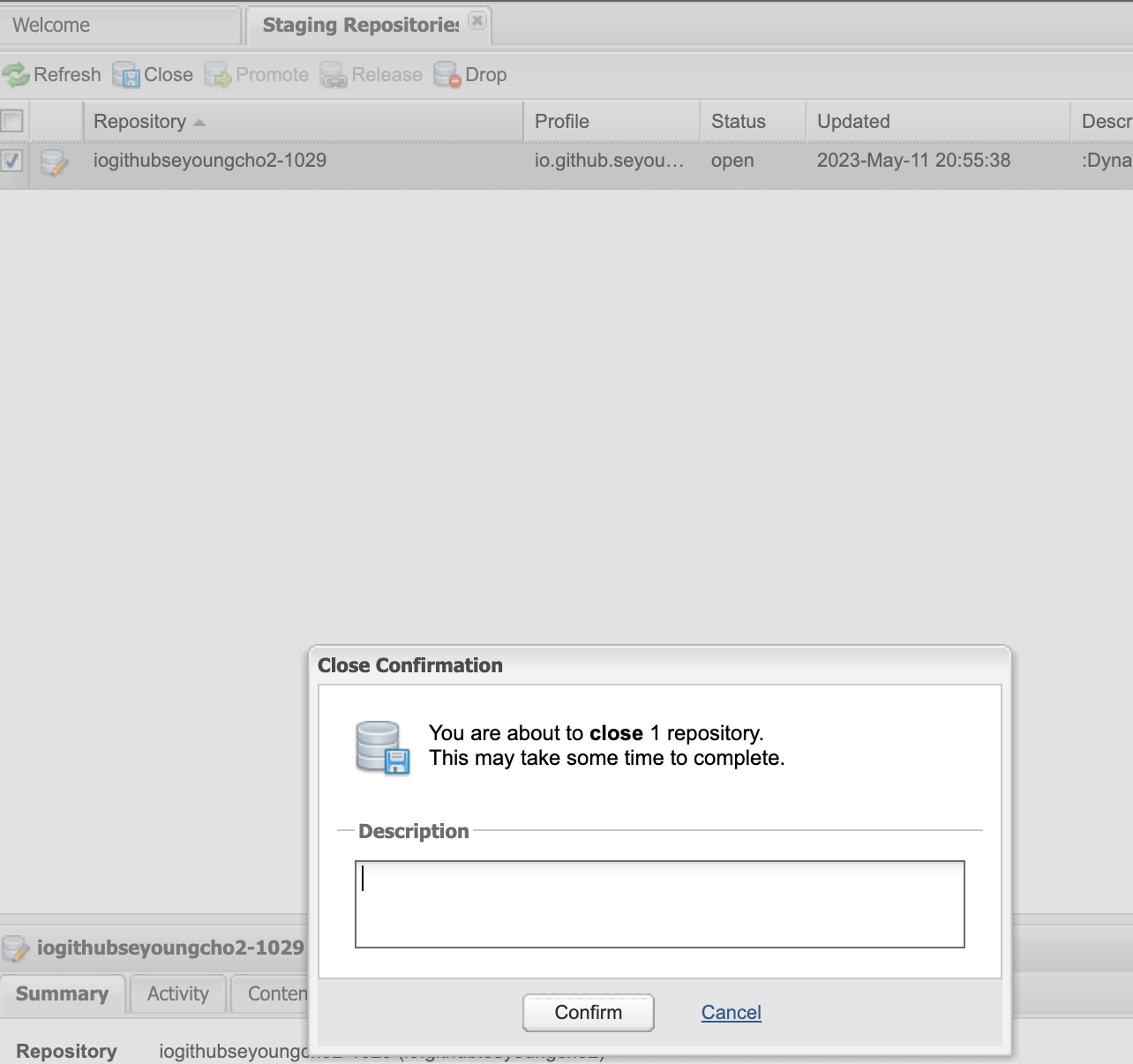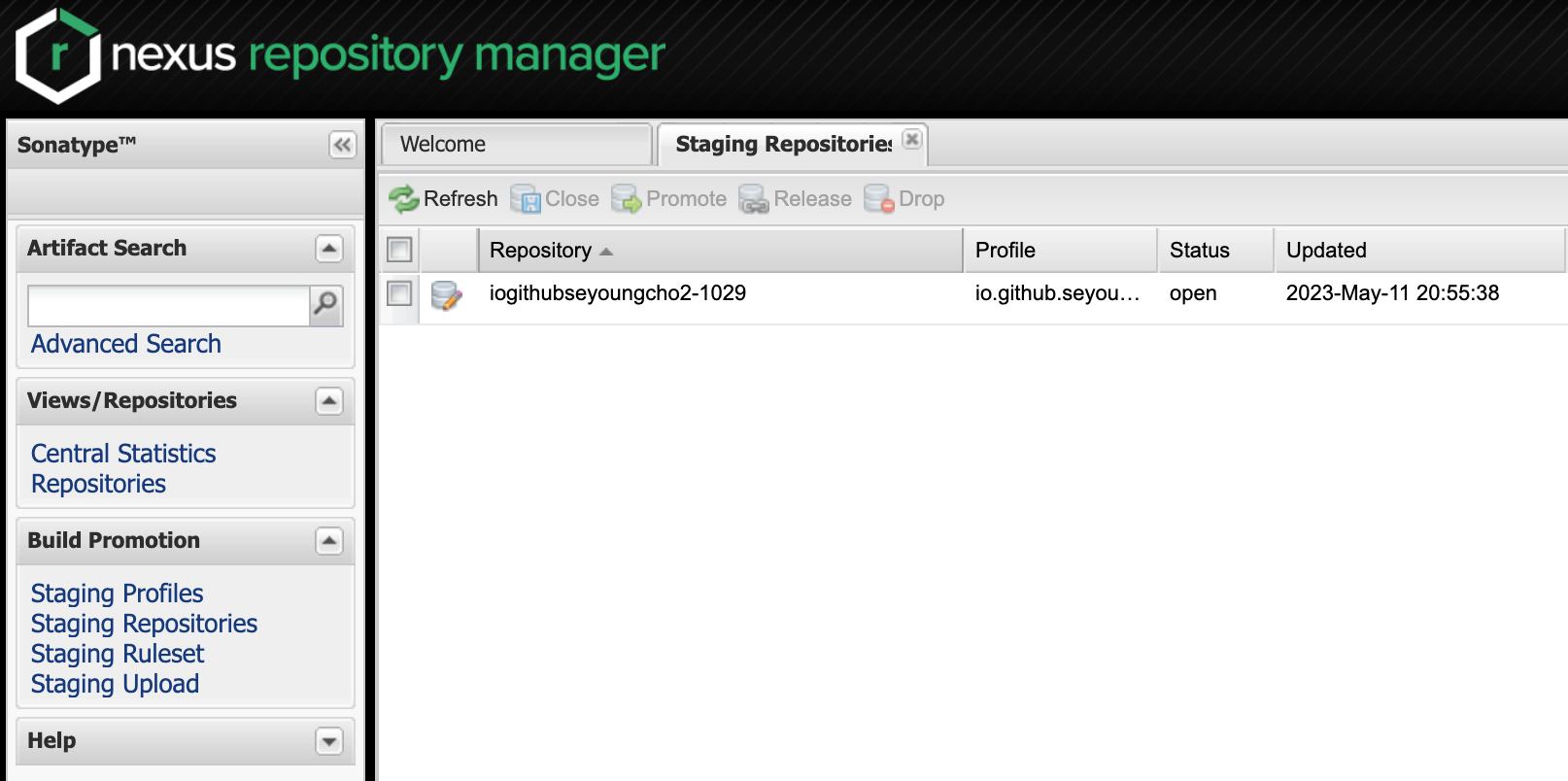 BUILD SUCCESSFUL이 나오면 https://s01.oss.sonatype.org/#stagingRepositories 에서 아래와 같이 라이브러리가 올라간 것을 확인할 수 있다.