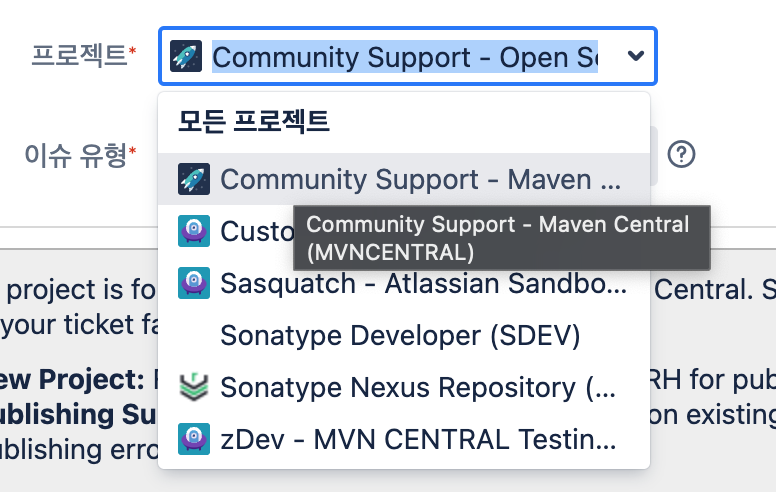2. 프로젝트는 Community Support - Maven Central(MVNCENTRAL)로 설정한다.