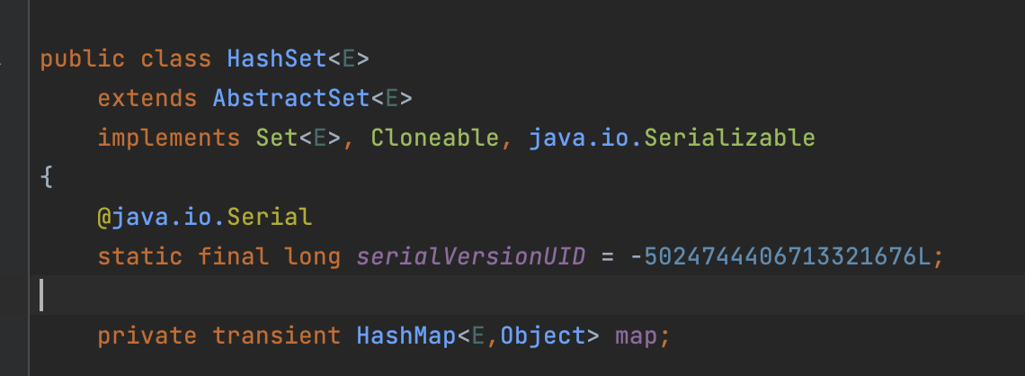 이 HashSet은 내부에서 HashMap 자료구조를 사용해 원소를 저장한다. 만약 우리가 Set<Integer> 이라는 Set을 생성하면 내부에서는 HashMap<Integer, Object> 라는 자료 구조가 사용 되는 것이다.